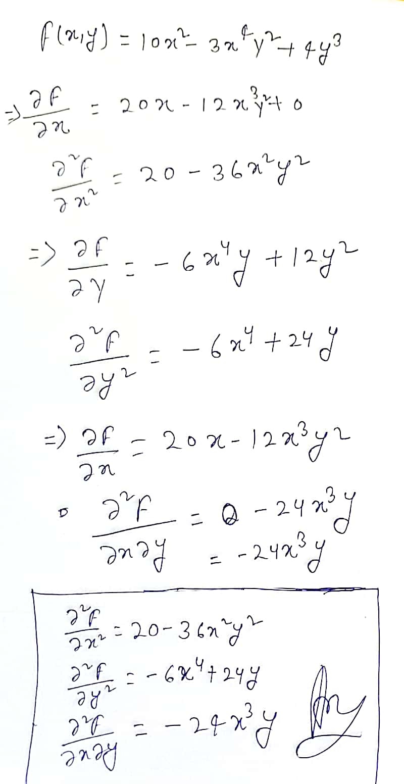 It's simple just consider a function f (x, y) = x²+y³, to obtain partial derivatives, you need to differentiate the function with respect to x and y separately and add them together. Z = 9u u2 + 5v. Z = 9 u u 2 + 5 v. F y ( x, y) = ( x 2 − 15 y 2) cos ( 4 x) e x 2 y − 5 y 3 f y ( x, y) = ( x 2 − 15 y 2) cos ( 4 x) e x 2 y − 5 y 3. For the same f, calculate ∂f∂x(1,2).